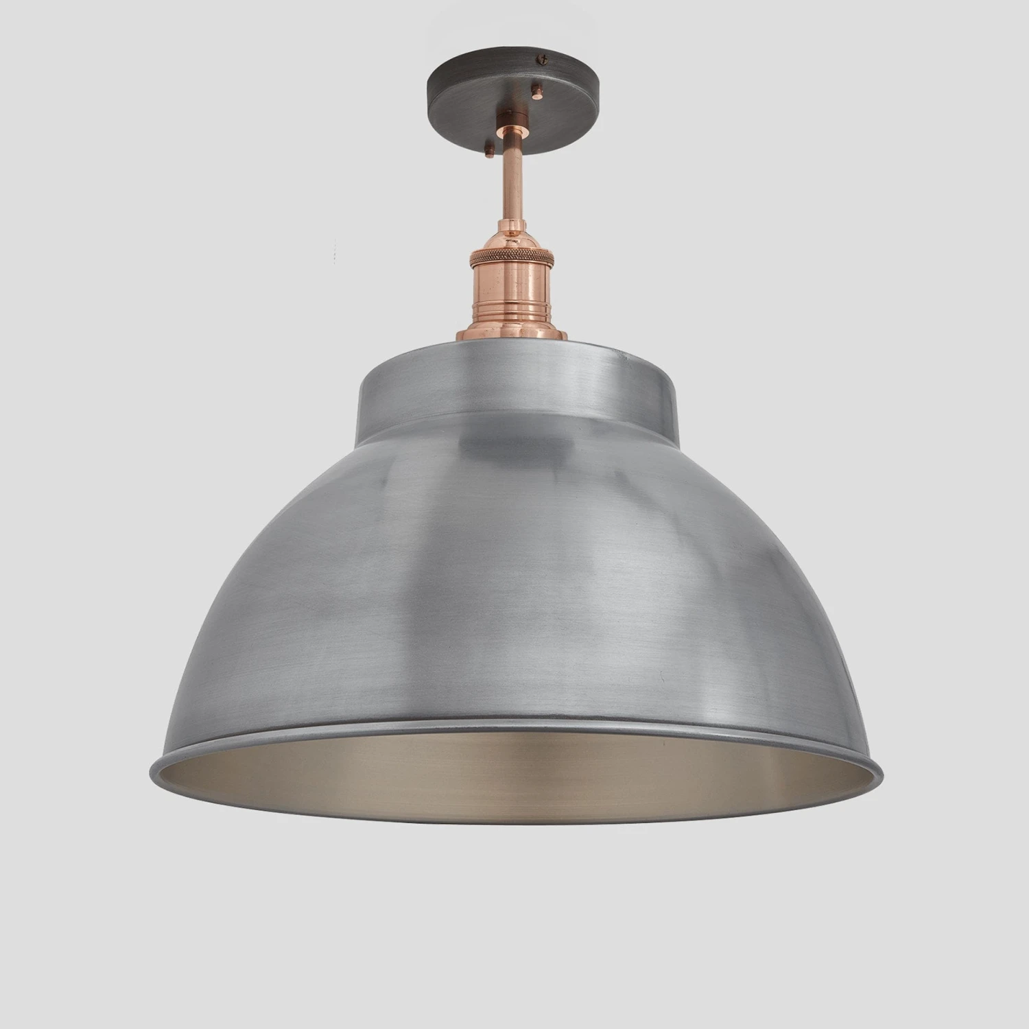 This handcrafted Brooklyn Dome Flush Mount is available in a variety of finishes Brass, Brass & Pewter, Pewter, Copper and Copper & Pewter. It works particularly well when mounted in pairs or groups of three, and you can make the lighting yours by choosing from an array of wall holders.