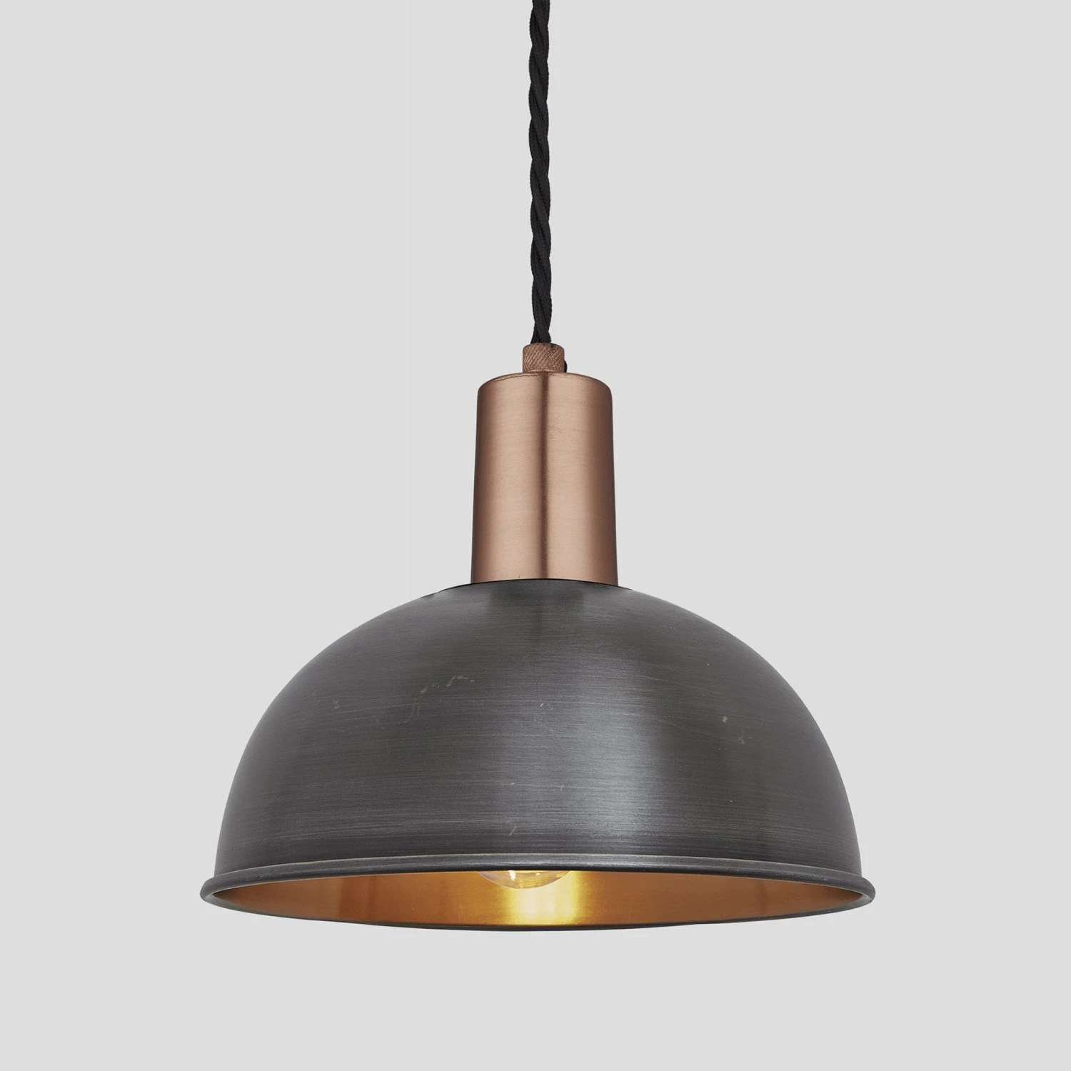 This handcrafted Sleek Dome Light is available in a variety of finishes Brass, Pewter & Brass, Pewter and Copper. This is also available in a larger 13 Inch shade. You can make the lighting yours by choosing from an array of Pendant Holders. To keep your design consistent throughout your spaces we have matching Sleek Edison Wall Light in Brass, Pewter and Copper which compliments our pendants. This product comes with 1 M of Black Twisted Fabric Flex, which can be adjusted accordingly. Our Sleek Dome Lights are a style which never goes out of fashion, complementing both classic and contemporary décor.