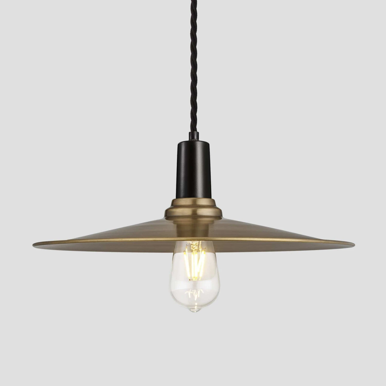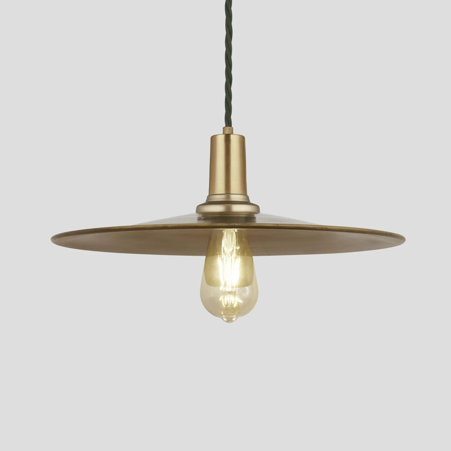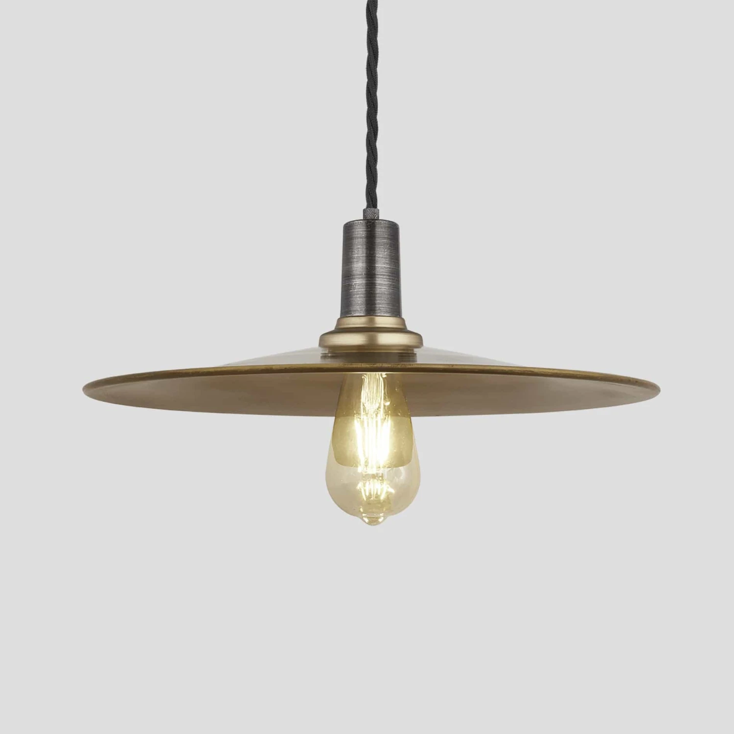 Our Sleek Flat 15 Inch Pendant Light is also available in Pewter and Copperand is perfect for any space providing that rustic industrial look. There’s a larger 8 Inch variation available in Brass, Pewter and Copper. When used together, particularly when hung in 3s and 5s, the flow of lighting enhances the feel of the space.