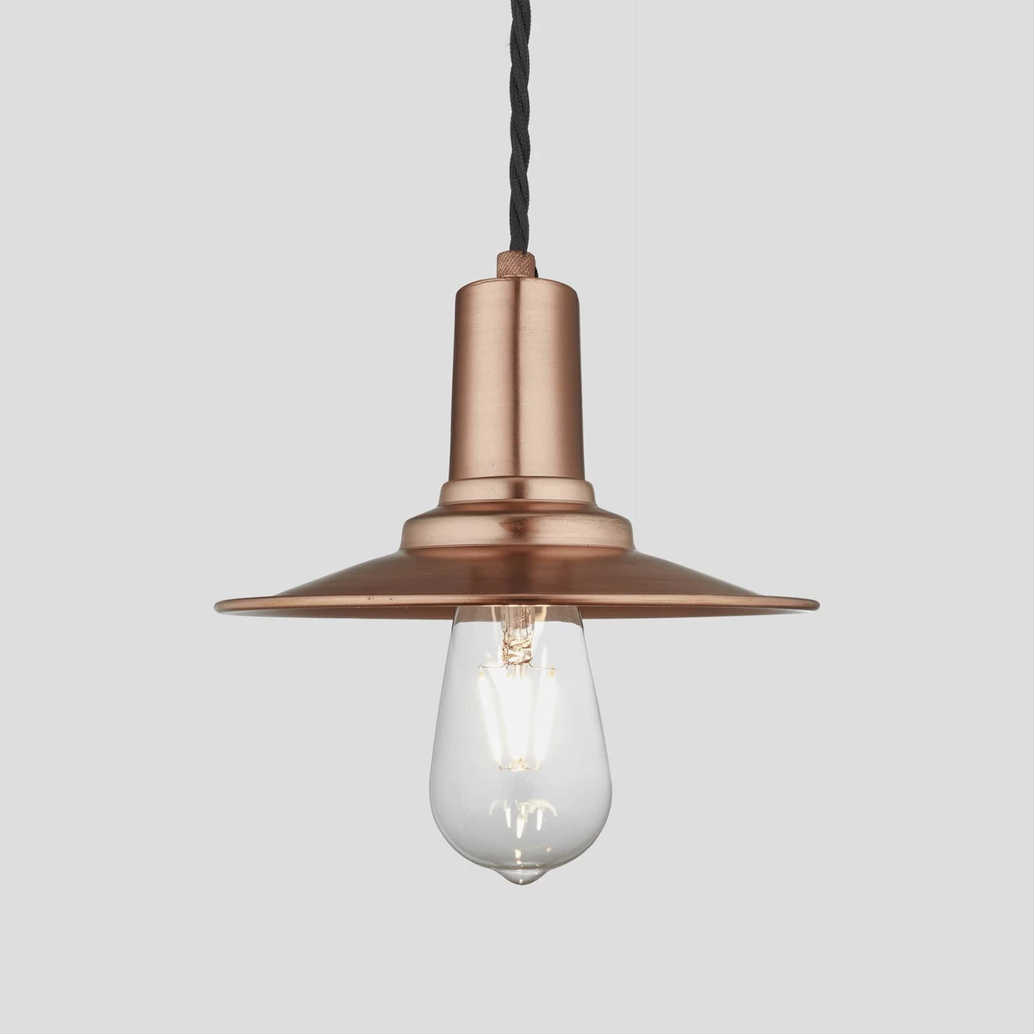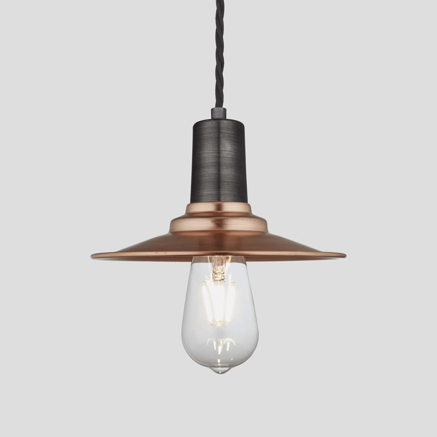 Our Sleek Flat 8 Inch Pendant Light is also available in Pewter and Brass. There’s a larger 15 Inch variation available in Brass, Pewter and Copper. When used together, particularly when arranged in groups of three and five, the flow of lighting enhances social settings.